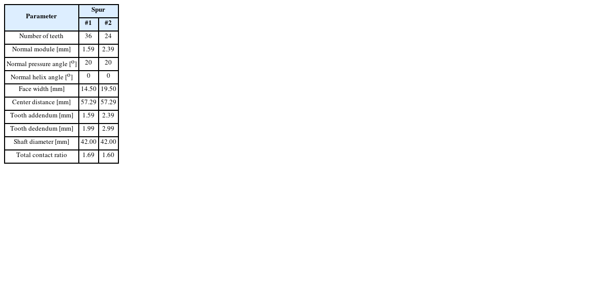 Table 1은 타겟 기어의 제원으로 스퍼 기어 #1은 모듈이 1.59이고, 스퍼 기어 #2는 모듈이 2.39이다. 두 기어에서 모듈이외의 모든 제원은 동일하게 가져가도록 하였다.