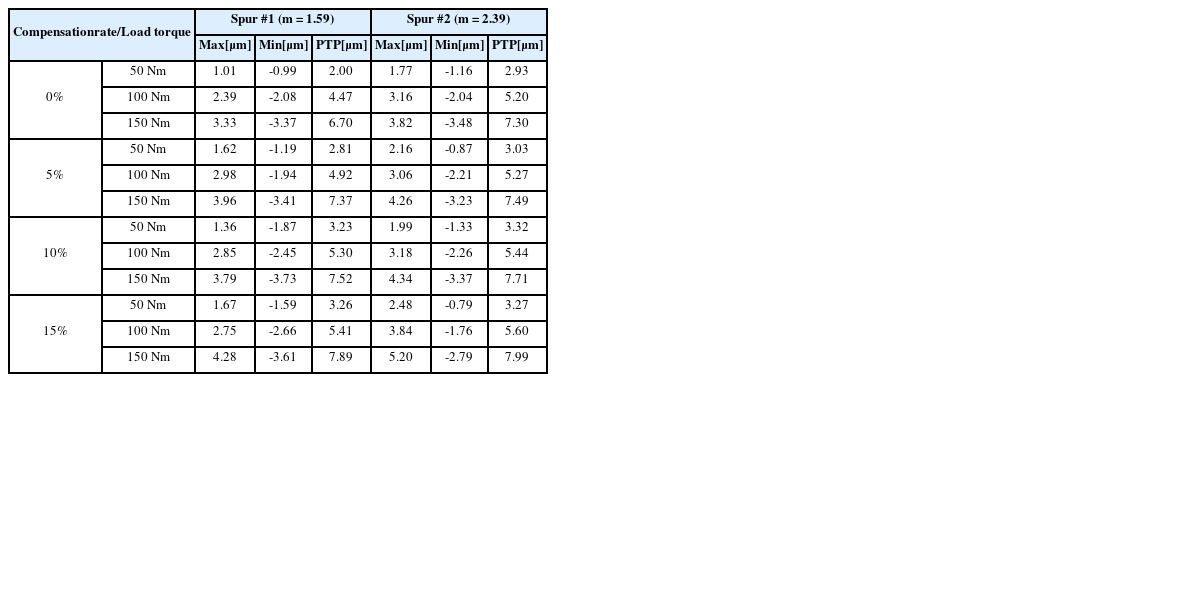 해석과 시험에서의 전달오차 최대진폭값을 비교한 결과로부터 다음을 알 수 있다. 첫째로 전위 비율, 기어 모듈에 비교해서 부하 토크 증가에 가장 민감하게 전달오차 최대진폭이 증가한다. 둘째로 기어 모듈, 전위 비율의 증가에 따라 전달오차 최대진폭값은 비교적 작게 선형적으로 증가한다. 셋째로 기어 물림률과 기어 모듈의 반비례 관계에서 알 수 있듯이 전달오차 최대진폭값은 해석과 시험에서 동일하게 물림률이 큰 스퍼 기어 #1이 전달오차가 작게 나타났다.