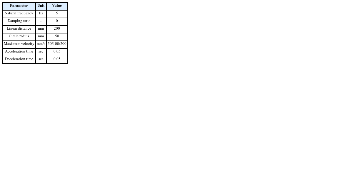 Table 1과 같다. 최대 이송 속도를 100, 200 mm/s로 하여 이송시킨 경우 잔류진동으로 인해 검은 실선으로 표시된 기준 궤도로부터 크게 벗어나는 것을 볼 수 있다. 또한 속도를 높이면 이 같은 진동체의 궤적 오차는 더욱 커짐을 알 수 있다.
