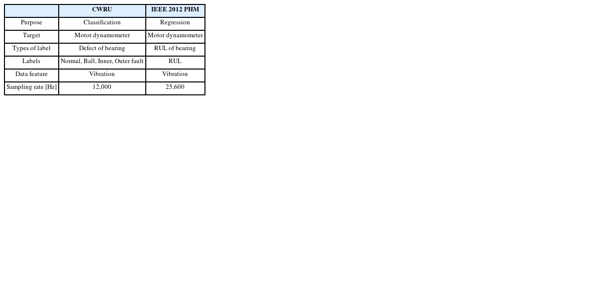 12]. 해당 데이터 세트에는 정상, 볼 결함, 내륜 결함, 외륜 결함에 대한 진동 데이터가 존재한다. 회귀 모델을 이용하는 RUL 예측에 대한 검증을 위해서는 IEEE의 2012년 PHM 데이터 챌린지의 베어링 RUL 데이터 세트를 활용하였다
