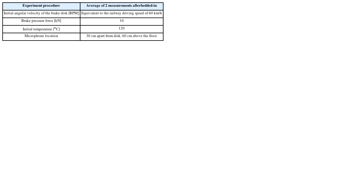 Fig. 7 to measure the actual squeal noise of the brake system. Measurement was started while maintaining rotation at a rotational speed equivalent to the railway driving speed of 60 km/h, and squeal noise measurement experiment was performed until a brake pressure force of 10 kN was applied and completely stopped. The measurement point of the microphone is 30 cm apart from disk, 60 cm above the floor. Detailed experiment conditions are summarized in