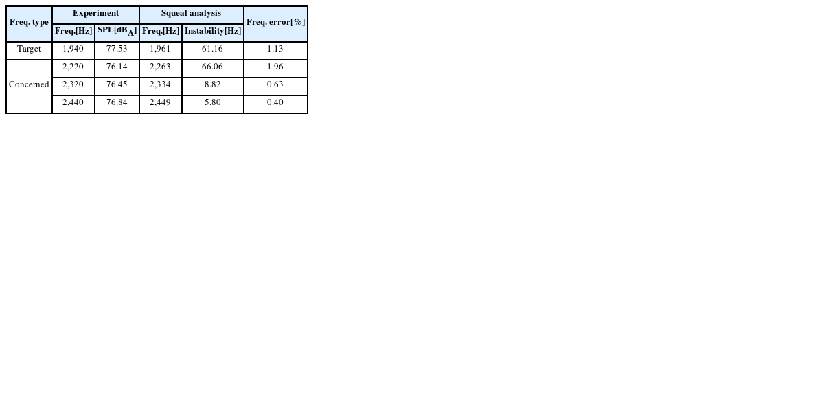 A, was appeared at 1,940 Hz, and there were local peaks at 2,220, 2,320, and 2,440 Hz. 1,940 Hz was selected as the target squeal frequency to be reduced, and other frequencies as the concerned frequencies. The SPL magnitudes of every considered frequency is shown in