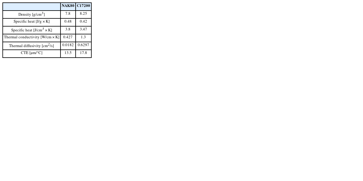 3 × K로 NAK80이 약 1.09배 높은 수치를 나타내고, 열전도도는 각각 0.427, 1.3 W/cm × K로 약 3배 C17200 몰드 금속에서 높은 수치를 나타낸다. 이와 같이 열 물성치에서 C17200이 NAK80에 비해 높은 수치를 나타내지만 급속가열 실험에서는 NAK80의 승온속도가 높게 나타났다. 이와 같은 차이는 두 몰드 금속의 열팽창 계수의 차이로 나타났다. NAK80과 C17200 각 몰드 금속의 열팽창 계수는 13.5, 17.8 μm/°C 이며,