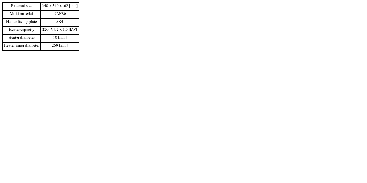 Table 1에 금형 규격을 나타내었다. 압력패킹 외경은 255 mm이고, 금형 외형은 340 × 340 × t62 mm로 실제 상형 및 하형 금형의 두께는 20 mm이고, 금형강을 사용하여 제작하였다. 그리고 Ø10 mm인 히터가 들어갈 수 있도록 U자형으로 가공하여 히터를 삽입한 후 두께 12 mm 고탄소공구강 판재로 고정하였다. 금형 방향 쪽으로 U자의 라운드 부분이 향하도록 함으로서 금형 쪽과의 면접촉에 의해 열전달이 잘되도록 하였고, 고정판의 경우는 선 접촉되도록 하여 열전달 및 손실을 최소화하는 구조로 설계 제작하였다.