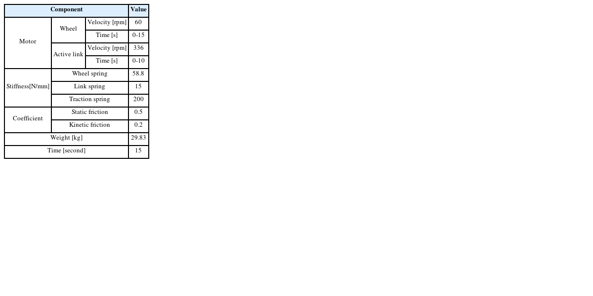 식(2)로 계산된 구동 링크의 직선 이동 거리 50.71와 114.85 mm 사이에 발생한다. 또, 상부 바퀴의 접촉 전 견인력은 아래 4개 구동 바퀴와 로봇 무게에 의해 발생하고, 크기는