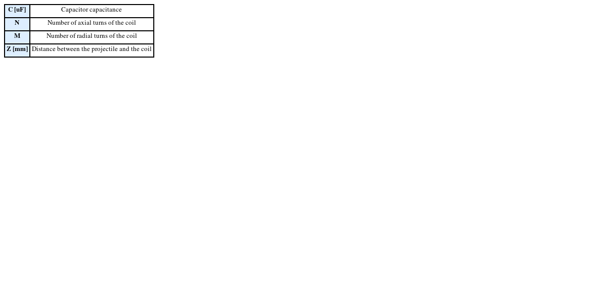 The cycle T of the solenoid coil current is determined by the inductance, resistance, and capacitance of the coil, and the amplitude of the solenoid coil current is determined by the charging voltage and charging capacity of the capacitor. The two elements, solenoid coil and capacitor, determine the cycle in the RLC function. Therefore, the capacitor capacity should be designed along with the turns of the solenoid coil. Since the charging voltage of the capacitor does not affect the cycle, this study didn’t set the charging voltage of the capacitor as a design variable. Instead, the charging voltage of the capacitor was fixed at 400 V because a capacitor with a charging voltage of 400 V was used for the production of the prototype.