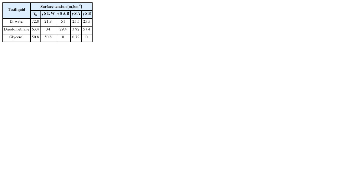 [8]. 2017년 Alam, et al.은 다양한 소재들의 표면 특성에 따른 바이오 소재의 접합 특성을 알아보고자 소재들의 표면에너지, 거칠기 및 습윤성을 분석하여 이를 평가하였다