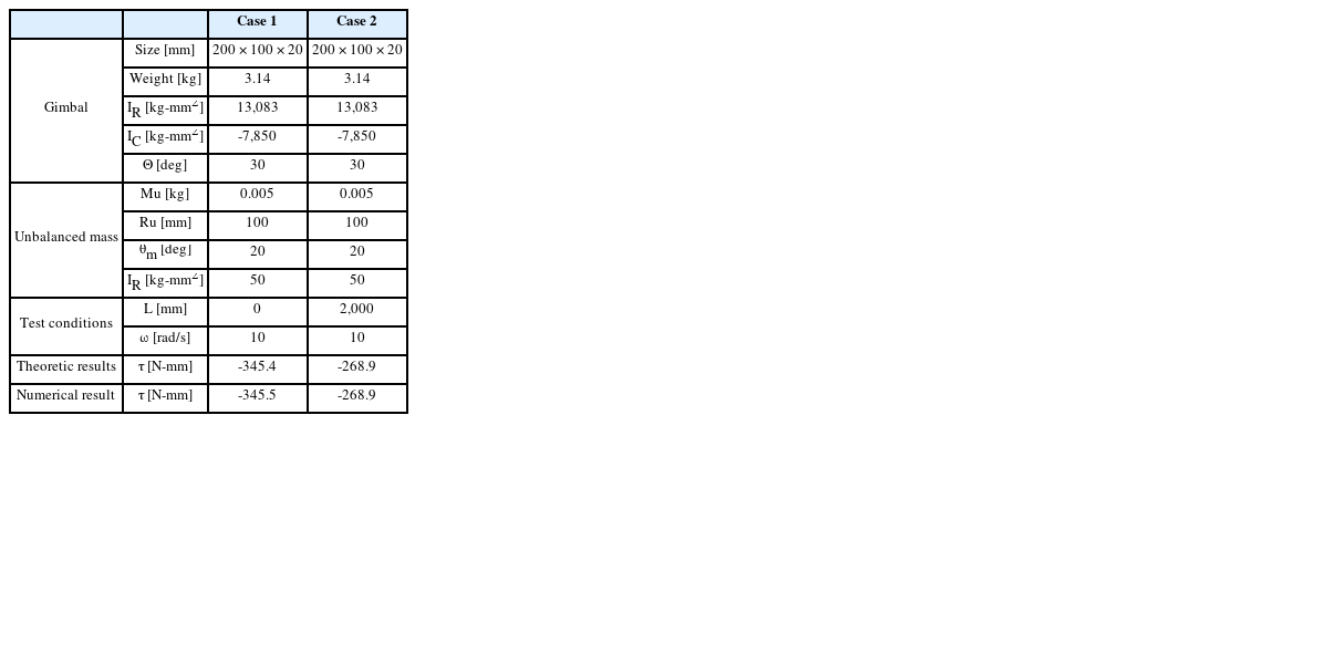 식(23)에 대한 검증을 수치 해석으로 진행하였다. 이때 추가로 가속도에 따른 짐벌의 외란 토크 차이를 분석하기 위해 회전반경을 0과 L 두 가지로 적용하였으며, 상세정보는