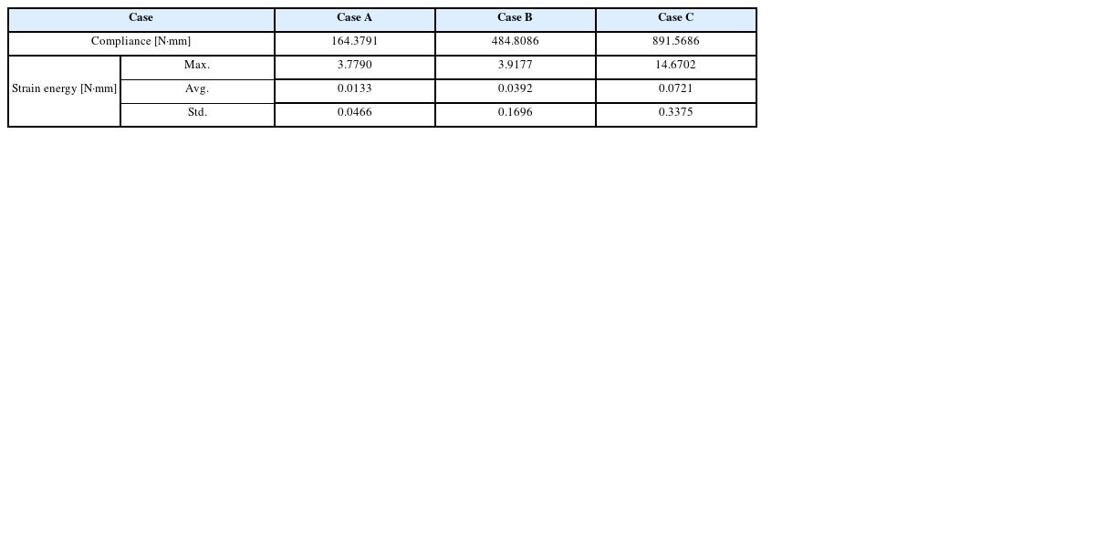 마지막으로 본 연구는 제한조건의 부피분율(0.2, 0.3, 0.4, 0.5)과 민감도 필터링 크기(1, 2, 3, 4 px)에 따른 전동 킥보드 연결부의 위상 변화를 분석하기 위해 하이퍼 파라미터(Hyperparameter) 값으로 선정하여 총 16개의 연결부 위상을 도출하였다. 위상최적설계는 MATLAB R2017a의 In-House 코드를 작성하여 수행되었다. 그리고 각 위상최적설계는 DESKTOP (CPU: AMD Ryzen 3700X, GPU: GeForce 1,660, RAM: 8 GB) 기준 평균 10시간을 요구하였다.
