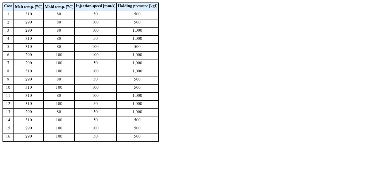 Table 3은 실험 계획법에 의해 제시된 사출조건을 보여준다. 3가지의 SFT별로 16개의 사출조건을 사용하였으며, 총 48개의 샘플이 제작되어졌다.