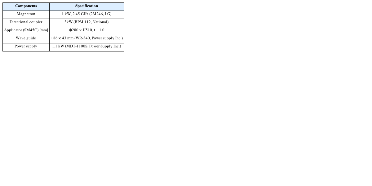 Fig. 1과 같다. 1 kW 출력을 갖는 마그네트론 2개를 사용하고 있으며 도파관(Wave Guide)을 통해 건조기 본체(Applicator)로 마이크로파가 전달되며 마그네트론 작동 시 출력량과 반사량은 방향성정합기(Directional Coupler)를 통해 상시 모니터링함으로써 과도한 반사에 의해 마그네트론의 손상이 발생하지 않도록 구성하였다. 마이크로파 가열건조기의 본체는 원통 형태를 갖고 있으며 제원을