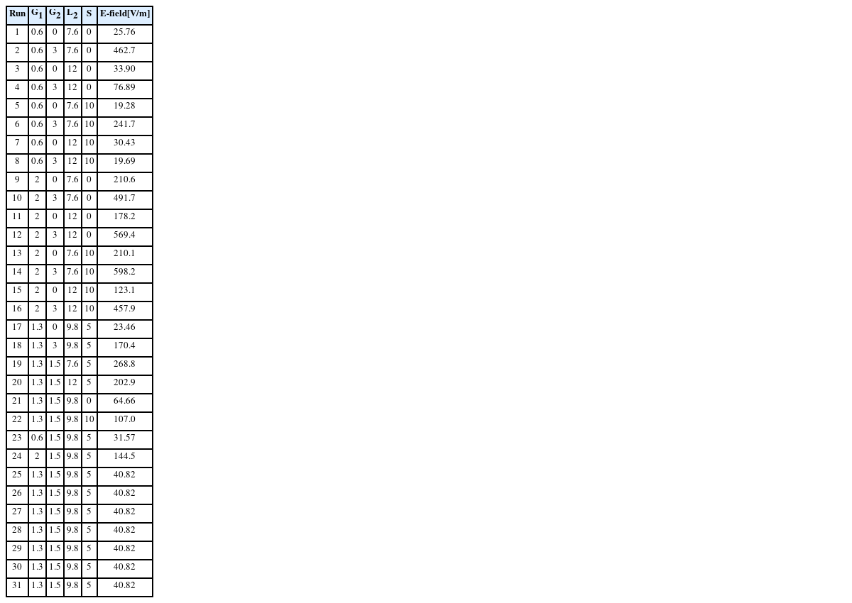 식(3)의 회귀방정식을 통해서 누설량(E-field)를 최소화하기 위해 인자들의 최적 조합을 찾는 반응 최적화를 실시하여 결과를
