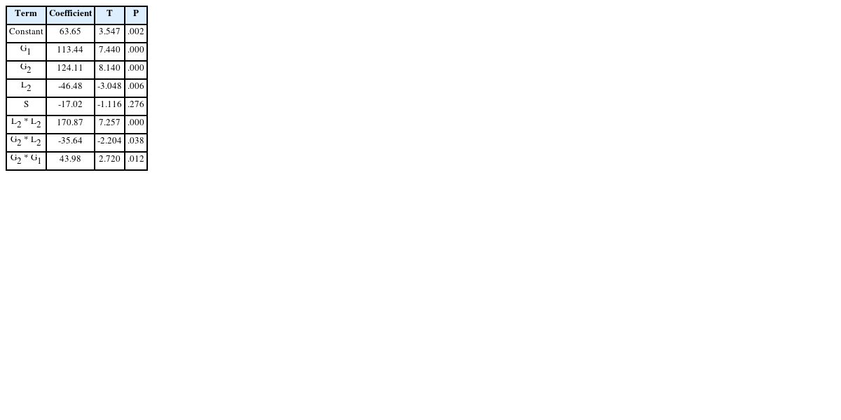 Table 6에서 보듯이 요인 S는 p-value가 0.276으로 반응값에 적은 영향을 미치지만 4개의 설계인자 중 하나의 인자로서 회귀방정식에 포함되어야 한다.