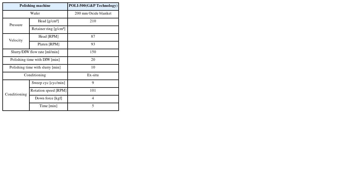 연마 실험은 G&P Technology 사의 POLI-500 장비와 KPX 사의 KONI 패드를 사용하였다. Tables 12에 브레이크 인과 실제 연마 조건을 상세히 기술하였다.