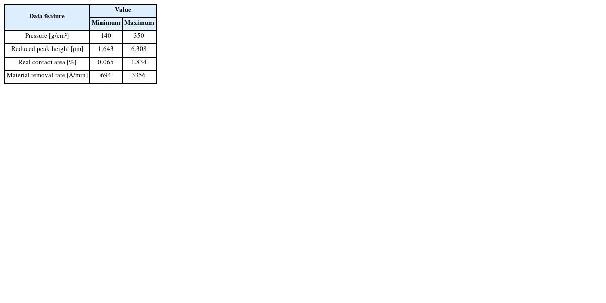 공정 변수에 따른 패드 표면의 열화를 학습 데이터에 반영하기 위해 웨이퍼에 가해지는 압력을 140 g/cm²에서 350 g/cm²까지 70 g/cm² 간격으로 증가시켰고, 웨이퍼 이탈 방지를 위해 리테이너 링의 압력은 210 g/cm²에서 420 g/cm²까지 70 g/cm² 간격으로 가압하여 1분씩 연마하였다. 재료 제거율은 K-MAC 사의 박막 두께 측정기인 ST5030-SL 장비를 사용하여 웨이퍼의 연마 전후 막 두께를 비교하여 측정하였다. 1, 2, 3, 5, 10분의 연마 시간과 10분의 연마로 패드 표면을 충분히 열화 시킨 후 10, 30, 60, 180, 300초의 각각 다른 컨디셔닝 공정을 수행하여 패드 표면의 회복을 다르게 한 후 표면 거칠기와 재료 제거율을 측정하였다. 실험을 통해 Fig. 7과 같이 각각 다른 조건에서 패드 표면 거칠기와 공정 압력에 따른 재료 제거율 데이터 220세트를 확보하였으며 각 데이터의 범위는 Table 3에 나타내었다.