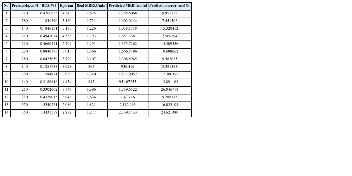 • As the digitization of the manufacturing process is accelerating, various data-driven approaches using machine learning are being developed in chemical mechanical polishing (CMP). For a more accurate prediction in contact-based CMP, it is necessary to consider the real-time changing pad surface roughness during polishing. Changes in pad surface roughness result in non-uniformity of the real contact pressure and friction applied to the wafer, which are the main causes of material removal rate variation. In this paper, we predicted the material removal rate based on pressure and surface roughness using a deep neural network (DNN). Reduced peak height (Rpk) and real contact area (RCA) were chosen as the key parameters indicative of the surface roughness of the pad, and 220 data were collected along with the process pressure. The collected data were normalized and separated in a 3 : 1 : 1 ratio to improve the predictive performance of the DNN model. The hyperparameters of the DNN model were optimized through random search techniques and 5 cross-validations. The optimized DNN model predicted the material removal rate with high accuracy in ex-situ CMP. This study is expected to be utilized in data-driven machine learning decision making for cyber-physical CMP systems in the future.