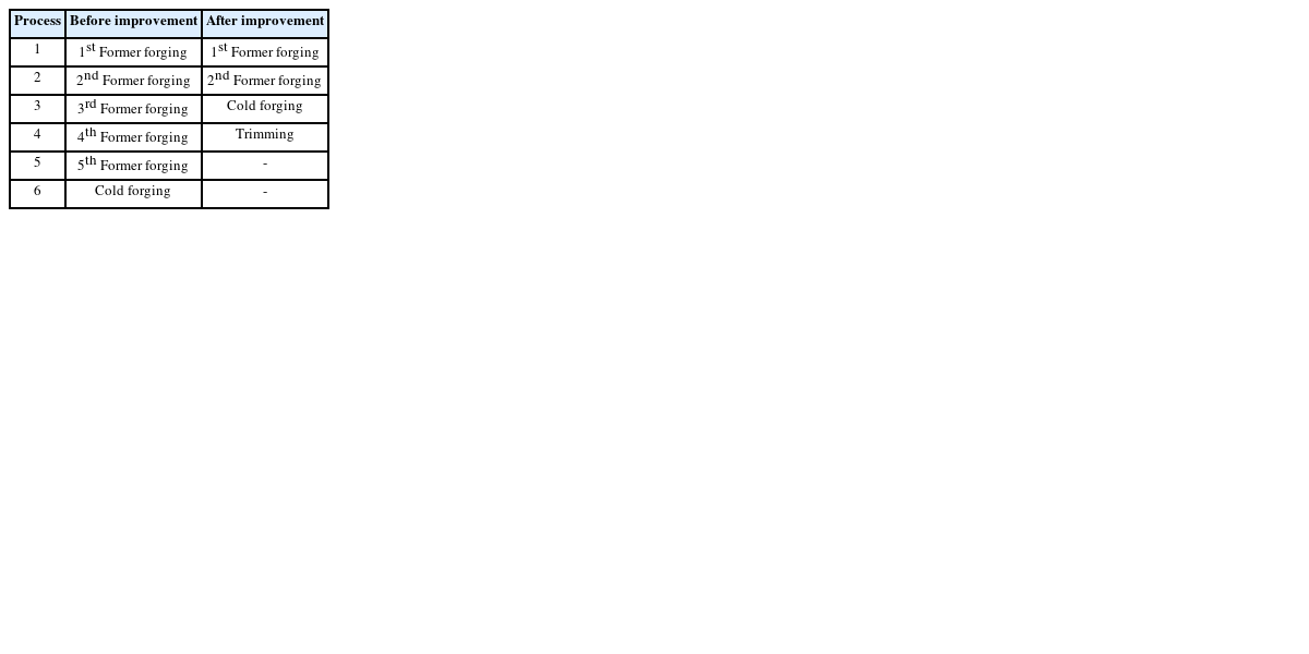 The whole process before improvement consists of a total of 6 processes, the fifth performing former forging, and the final closed cold forging process. In this case, punch and tool breakage due to concentrated load occurred frequently in the 5th process of former forging and the final closed cold forging process. To improve this, the former forging process was simplified to two processes, the closed cold forging process was improved to an open cold forging process, and a final trimming process was added to remove flash. In other words, in order to improve the damage of punches and dies due to concentrated load in the 5th process of the existing former forging process and the final closed cold forging process, edge processing is performed in the former forging process, and a trimming process is added after open cold forging in the cold forging process. Therefore, it was improved to distribute stress concentration between processes.