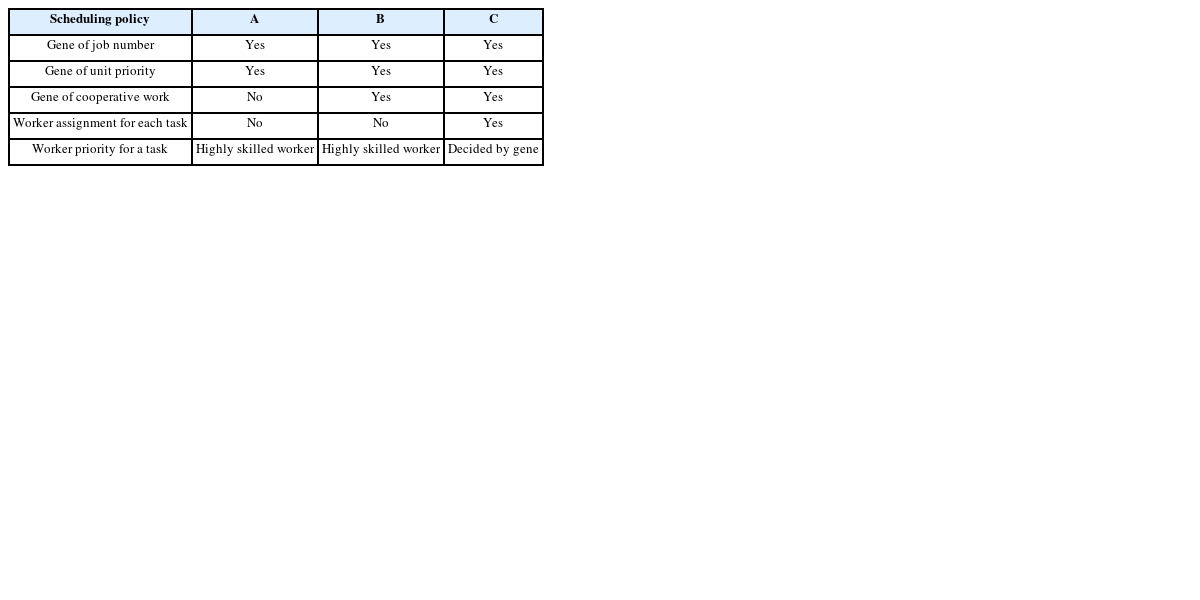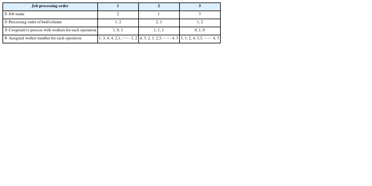 Table 1 shows the genes assigned to the three jobs, which are represented by genes assigned to four classes. The four classes are (1) job name, (2) processing order of bed/column, (3) cooperative process with workers for each operation, and (4) assigned worker number for each operation. These genes are considered as one chromosome. The parameter values of these genes in