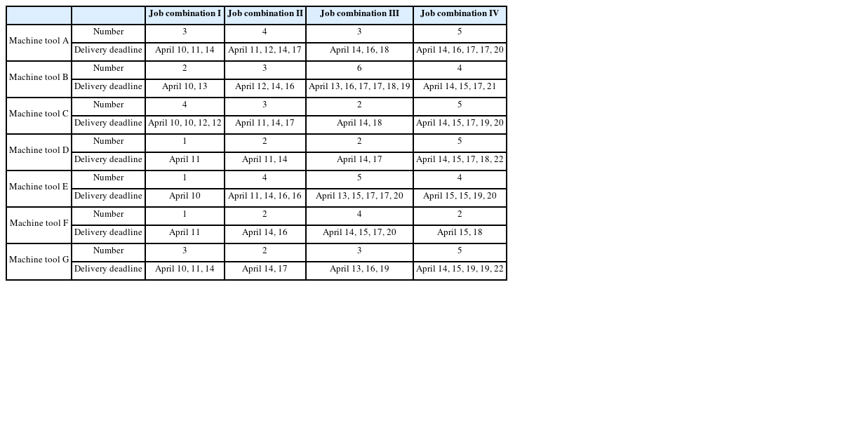 Table 4. The average value of 10 trials is shown. Based on a preliminary experiment, the number of generations of the genetic algorithm was set to 300. The calculation times per trial based on a computer with a Core i7-6600U CPU and 16 GB of memory, regardless of the rules, were as follows: 2 min when the number of jobs was 15; 4 min, 20; 6 min, 25; 8 min, 30.