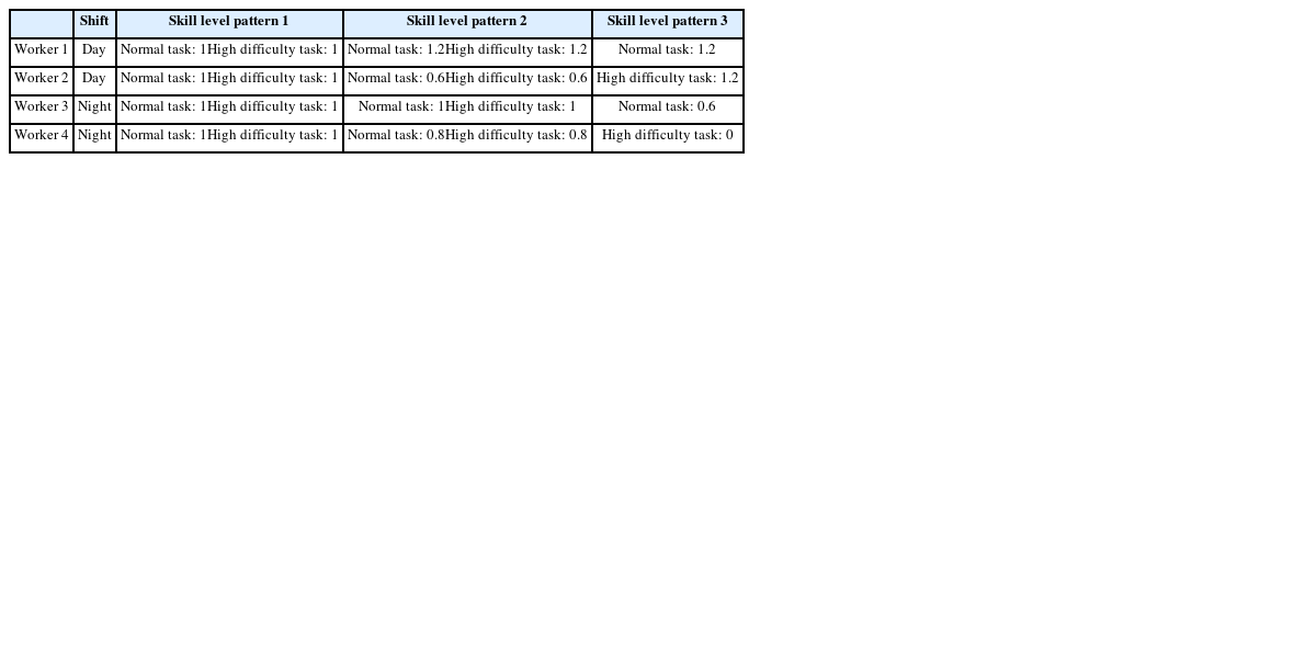 Subsequently, the worker goes to an arbitrary workplace and executes one process at a time. The worker’s skills are predetermined, whereas the ability to execute a specific process and the execution time change depending on the skill. In addition, the shift is predetermined for the worker, and the process can be executed during the shift, not outside the shift.