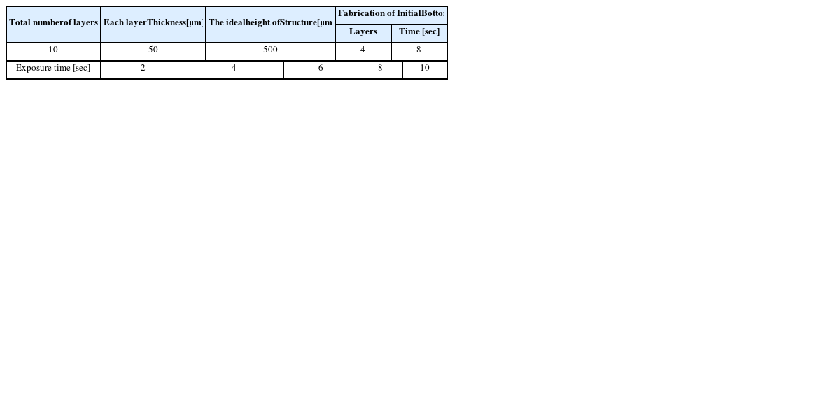 Figure 7 was utilized. Excluding the base layer curing time and the translation time of the build plate, a 3-dimensional model can be fabricated at a rate of 12.5 μm/sec. (Volumetric Height) with the optimal exposure time.