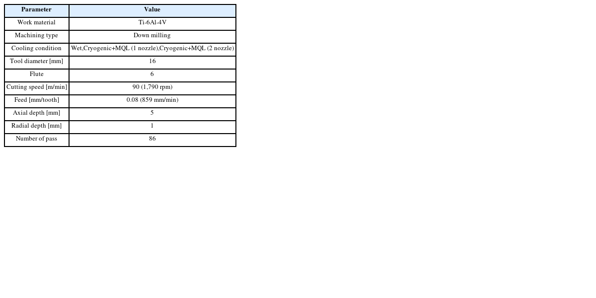 본 연구에서는 티타늄 합금 소재에 대해 극저온 MQL 가공을 진행하였으며, 실험 결과를 토대로 가공성 분석을 수행하였다. 상세한 내용은 하단에 나타난 바와 같다.