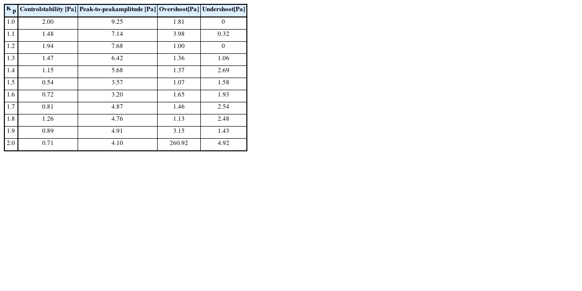 본 연구에서는 P제어의 최적 비례제어이득을 도출하기 위해 1.0에서 2.0의 범위에서 비례제어이득을 0.1의 단위로 상승시키며 ±1 kPa의 계단형 설정압력 변화에 대한 응답을 확인하였다. 본 연구에서는 제어압력 안정도에 주안점을 두고 평가하였으나 오버 슈트 및 언더 슈트 특성 역시 비교하여 불안정한 거동 발현이 제한되는 제어이득을 최적 제어이득으로 선정하고자 하였다.