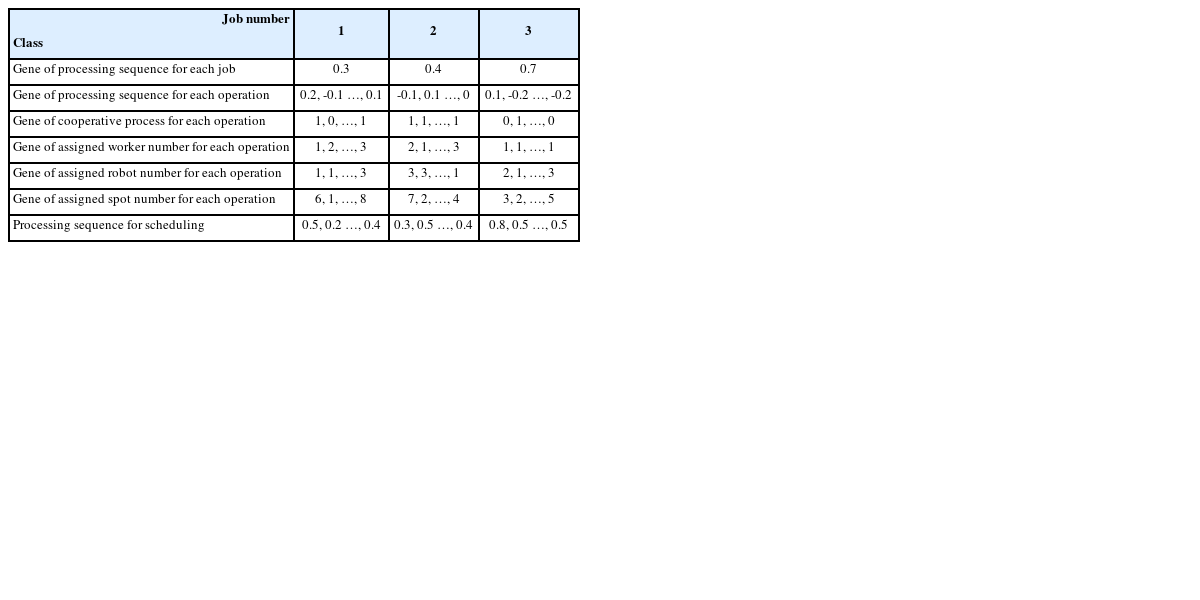 Jobs were represented by genes that were assigned to six classes. The six classes were composed of “(1) processing sequence for each job,” “(2) processing sequence for each operation,” “(3) cooperative process for each operation,” “(4) assigned worker number for each operation,” “(5) assigned robot number for each operation,” and “(6) assigned spot number for each operation”, which were real numbers or integers depending on the class