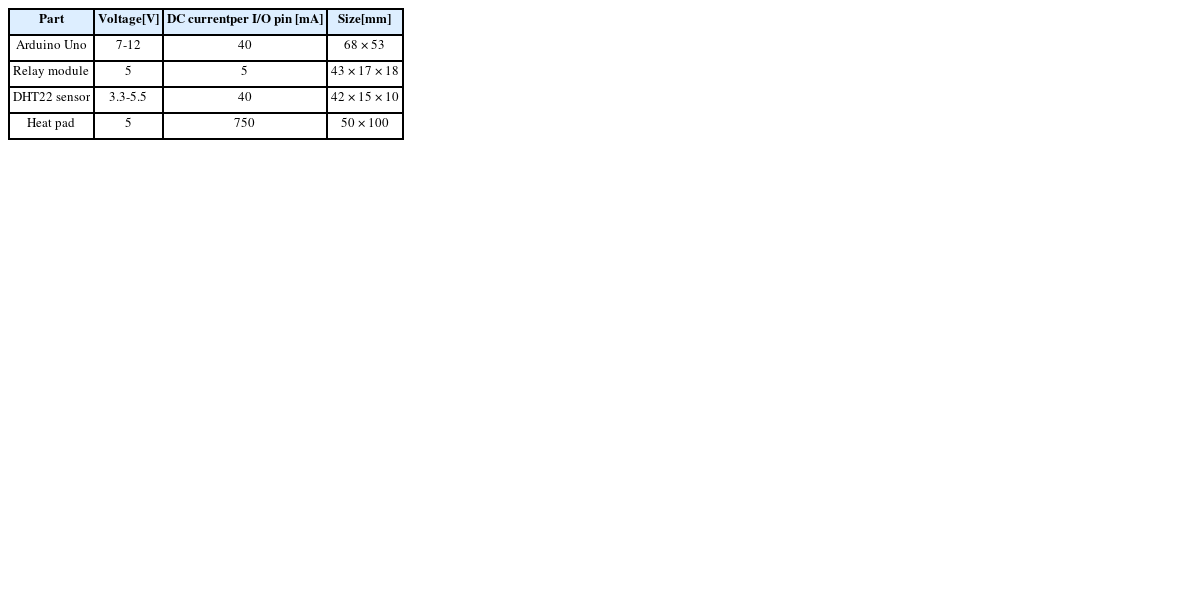 Table 1). 아두이노와 릴레이 모듈은 배양기 내부의 온도 및 습도를 조절하는 중추부이며 온·습도 복합 센서는 배양기 내부의 온도와 습도의 측정값을 아두이노에 전달한다. 또한 가습기 모듈과 발열패드는 아두이노의 명령을 받아 온도와 습도를 조절하며, 단열제는 발열패드 하단에 부착하여 발열 패드에서 발생하는 열이 배양기 내부의 다른 부품들에 전달되는 것을 방지한다.