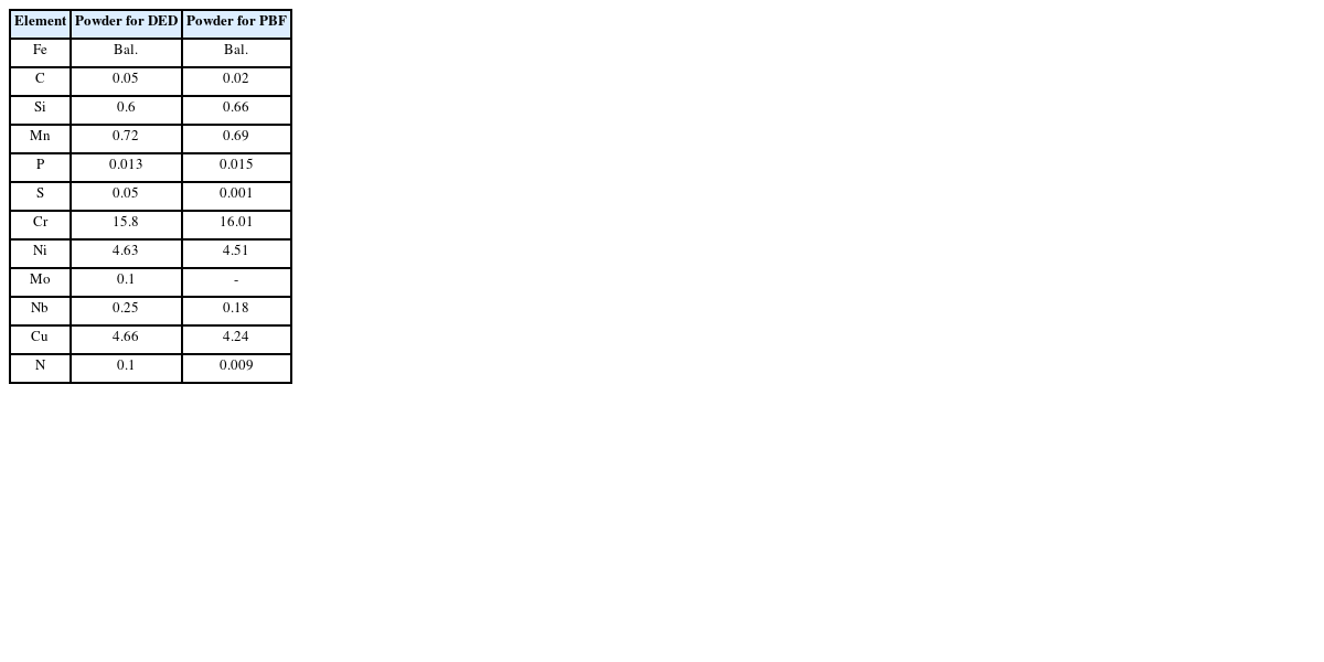 본 연구에서는 630 스테인레스강 분말을 이용하여 PBF를 통해 모재(Substrate)를 제작하였으며, 동일한 조성의 분말을 DED 적층에도 사용되었다. 630 스테인레스강의 특성은 석출 경화 열처리를 통해 향상될 수 있으며, 따라서 “단일 처리 마르텐사이트 강”이라고 한다.