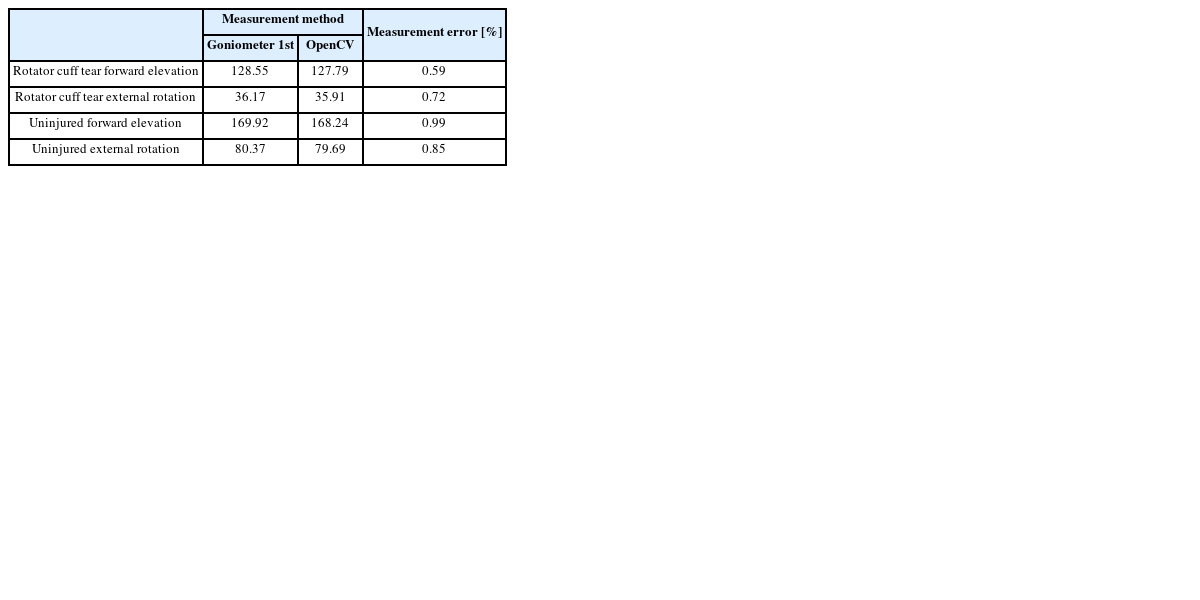 Table 1과 같으며 이는 최대 평균 측정오차가 0.99%로 매우 유사한 측정치를 보여주었다. 고니오미터와 OpenCV의 데이터 중 Forward Elevation을 기준으로 부상자의 각도는 최저 125.1°, 최대 130.5°로 이는 부상 상태 기준 각도인 161° 이하다. 또한, 문제가 없는 대상의 각도는 최저 165.51°, 최대 172.51°로 보통 상태 기준 각도인 160° 이상이었다. 그리고 고니오미터와 OpenCV의 데이터 모두 포함한 External Rotation을 기준으로 부상자의 각도는 최저 30.87°, 최대 40.76°로 부상 상태 기준 각도인 70° 이하로 적합함을 확인하였다. 또한, 문제가 없는 대상의 각도는 최저 77.45°, 최대 82.9°로 보통 상태 기준 각도인 45° 이상이며 부상자 기준 최대 각도인 70° 이상의 각도를 보였다. 이는