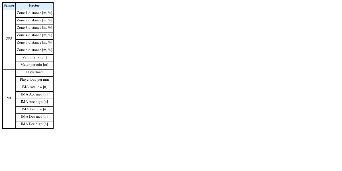 Table 1과 같다. 먼저 GPS센서로 측정되는 변인으로는 6개 구간별 이동거리와 구간별 이동비율, 최고속도(Velocity, km/h), 1분당 이동거리(Meter per min)를 활용하였으며, IMU센서로 측정되는 변인은 3축 가속도 움직임 값(Playerload)과 1분당 3축 가속도 움직임 값(Playerload per min), 강도별 가속과 감속 횟수를 활용하였다.