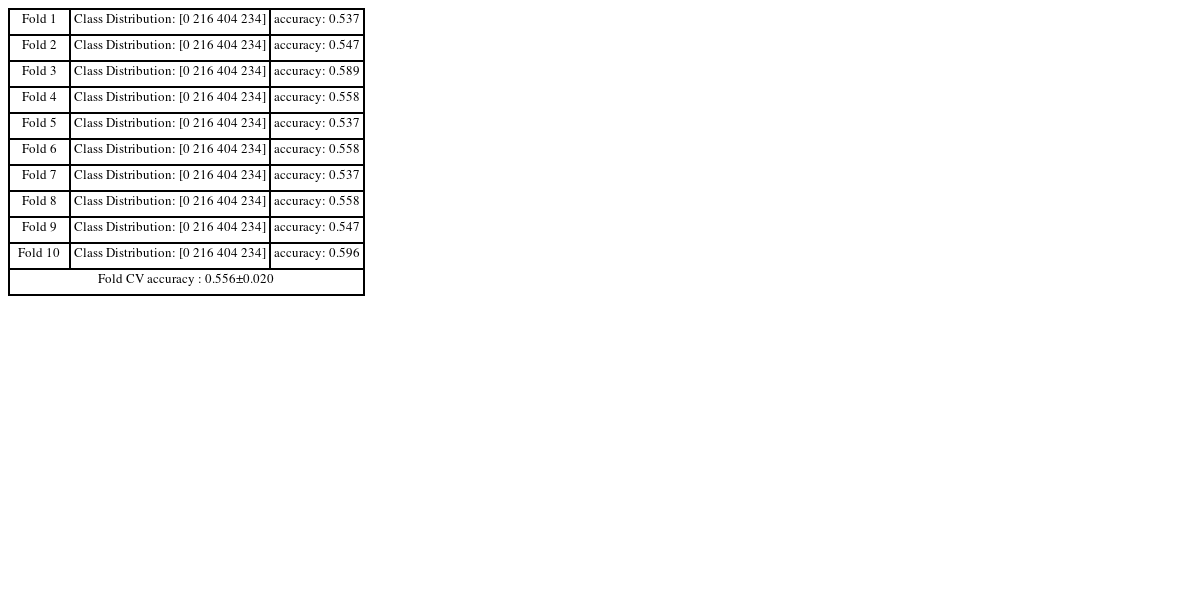 Table 8은 K-fold 교차검증으로 모든 데이터가 최소 1번은 테스트셋으로 쓰이도록 하여 10번의 테스트 결과 평균 정확도는 0.556±0.020으로 나타나 55.6±2.0%의 예측률로 확인되었다.