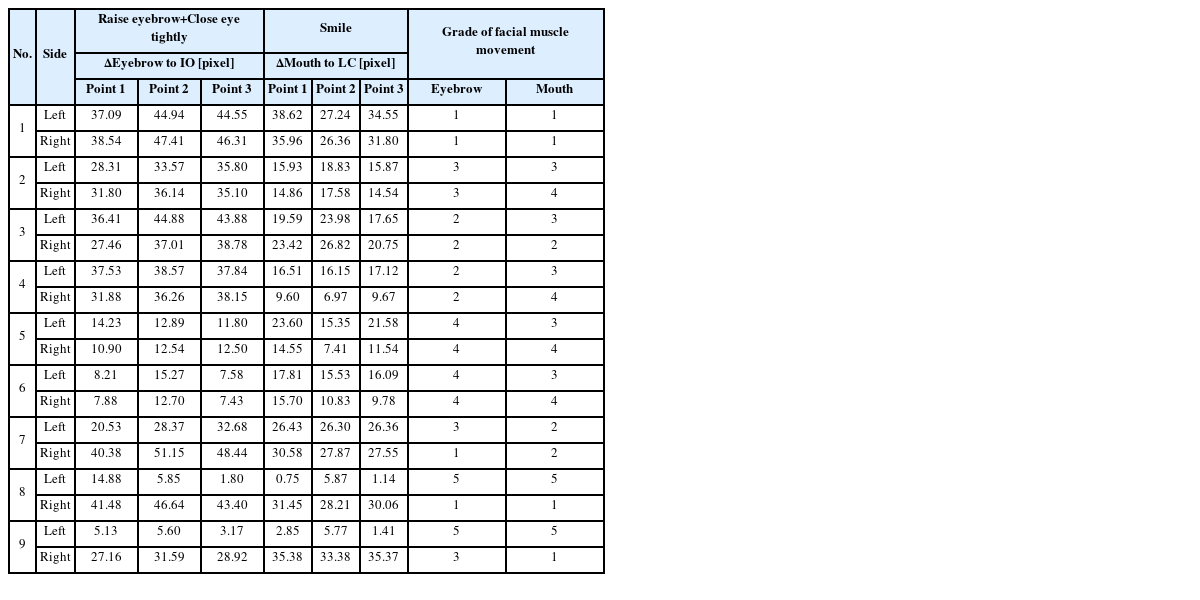 Table 4와 같이 좌우 각각에 대한 움직임 등급, 안면 대칭 정도와 그에 따른 HBGS 등급을 표시하고 기존 NS 스케일과 비교하여 그 차이를 확인했다.