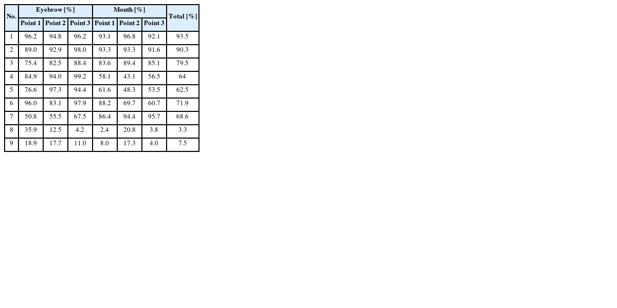8]. 벨 마비에 의해 나타나는 증상적 특징은 한쪽 얼굴이 처지는 것이 특징이며, 눈 깜박임, 미소짓기, 인상 찡그리기 및 눈썹 올리기 등과 같은 안면 근육 운동에 대한 제어에 영향을 준다고 알려져 있다[