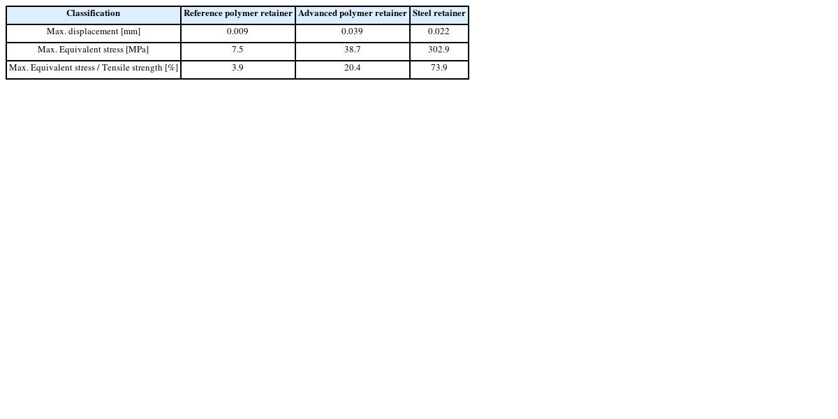 Table 3에서 각각의 리테이너 모델에 대한 최대 변위, 최대 등가 응력, 그리고 인장강도 대비 최대 등가 응력을 비교하였다.
