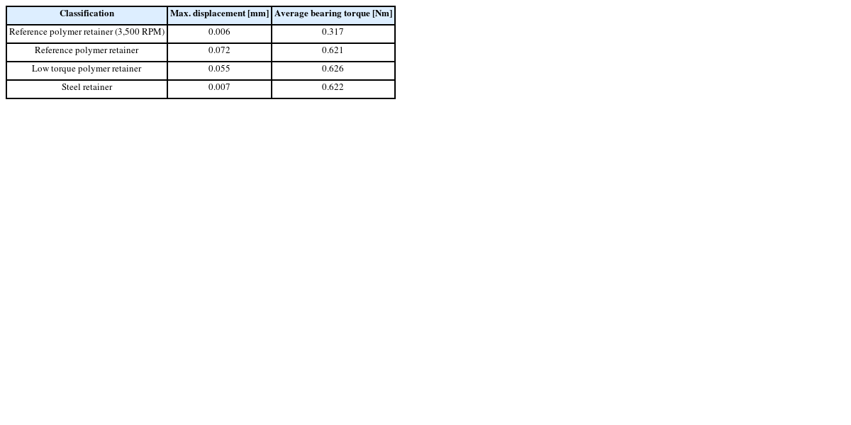 Fig. 8에서 일반적인 운전 속도(3,500 RPM)에서 동역학 해석을 수행한 결과를 보여주고 있다. 위에서부터 (a) 베어링의 동적 거동, (b) 표준 폴리머 리테이너의 변위, (c) 베어링 토크 및 (d) 리테이너 궤적 변화의 결과를 보여주고 있다. (a)에서는 축방향 하중에 의해 모든 전동체에 대해 동일한 접촉면압을 발생하는 것을 볼 수 있다. (b) 그래프는 유연체로 모델링된 리테이너의 노드별 변위를 보여주고 있다. (c)는 베어링 운전 중 토크의 변화를 보여주고 있으며, (d)는 리테이너 궤적의 변화를 보여주고 있다.