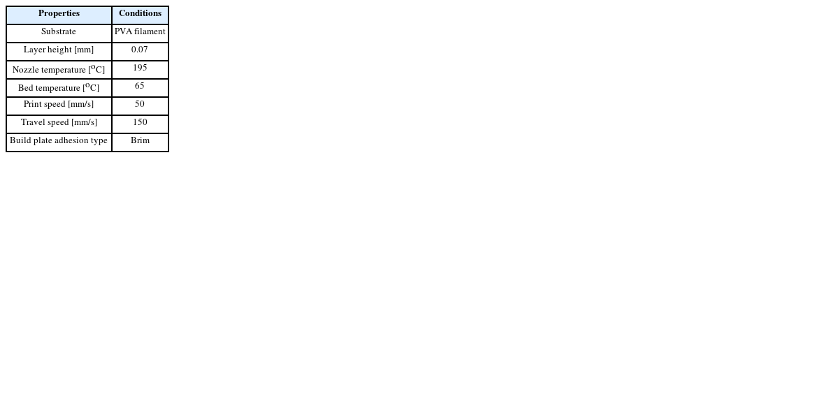 Table 1과 같다. 정제를 정밀하게 프린팅하여야 정제 내부의 격자 구조를 프린팅 할 수 있으므로 각 층의 높이는 가장 낮은 0.07 mm로 설정하였다. 또한, 정제가 플레이트에 원활하게 접착되기 위하여 브림(Brim)을 설정하여 첫 층을 프린트하기 전에 얇은 층을 형성하였다. PVA 필라멘트 프린팅에 적절한 노즐 온도는 190-210