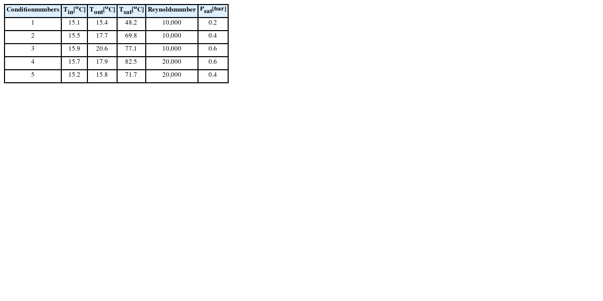 Table 1과 같이 설정했다. 관 내부에 흐르는 냉각수의 유량은 레이놀즈(Reynolds) 수 10,000, 20,000 두 가지로 설정했는데 유량이 클수록 관 외부의 표면 온도는 더 낮아진다. 포화 증기 압력은 챔버 내부로 투입하는 증기에 대한 포화 압력이며 단위는 bar로 0.2, 0.4, 0.6 세 가지로 설정했다. 두 변수에 따라 조건 #1부터 #5까지 다섯 가지 조건을 정의했는데 응축 실험은 포화도가 낮은 조건 #1부터 높은 조건 #5까지 오름차순으로 수행되었다.