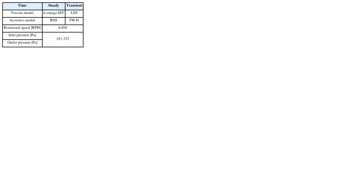 본 연구에서는 수렴성을 위하여 정상(Steady) 해석 값을 초기값으로 사용하여 과도(Transient) 해석을 진행하였다. 회전체에 대한 해석을 위해서 MRF(Multiple Reference Frame) 기법을 계산에 사용하였다. 정상 해석의 난류 모델은 Reynolds-Averaged Navier-Stokes (RANS)에 기반한 Shear Stress Transport(SST) k-ω 모델을 사용하였다. SST k-ω 모델은 벽면에서의 경계층 유동과 상류층에서의 등방성 자유 난류 예측에 적합하기 때문에 벽면에서의 자유 유동과 박리 현상이 동시에 고려되어야 하는 회전체 해석에 주로 사용되며, 다음과 같은 식으로 나타낼 수 있다