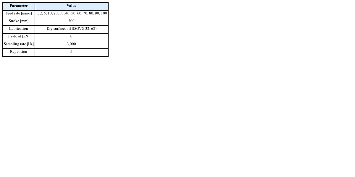 LM가이드의 이송실험을 통해 마찰력을 측정하기 위한 다양한 조건에서 실험을 수행하였다. LM가이드의 윤활조건은 무윤활, 국제규격점도(ISO Viscosity Grade, ISO-VG) 32, 68등 세가지이다. LM가이드에는 별도의 하중이 부가되지 않은 무부하 상태이다. LM가이드의 유활조건에 따른 Stribeck 곡선구성을 위한 이송속도는 1, 2, 5, 10 mm/s의 저속구간과 이후 10 mm/s 간격으로 100 mm/s까지 다양한 속도조건이 주어졌다.