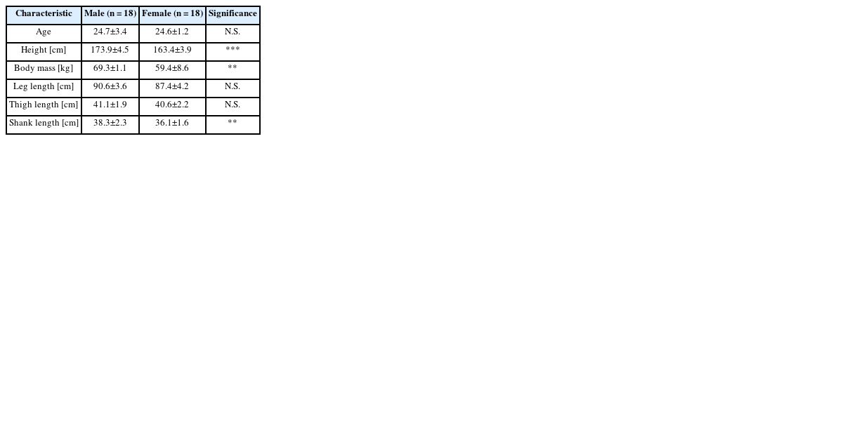 Table 1에서 피험자의 인체특성의 성차를 Mann-Whitney 방식으로 검정하였다.