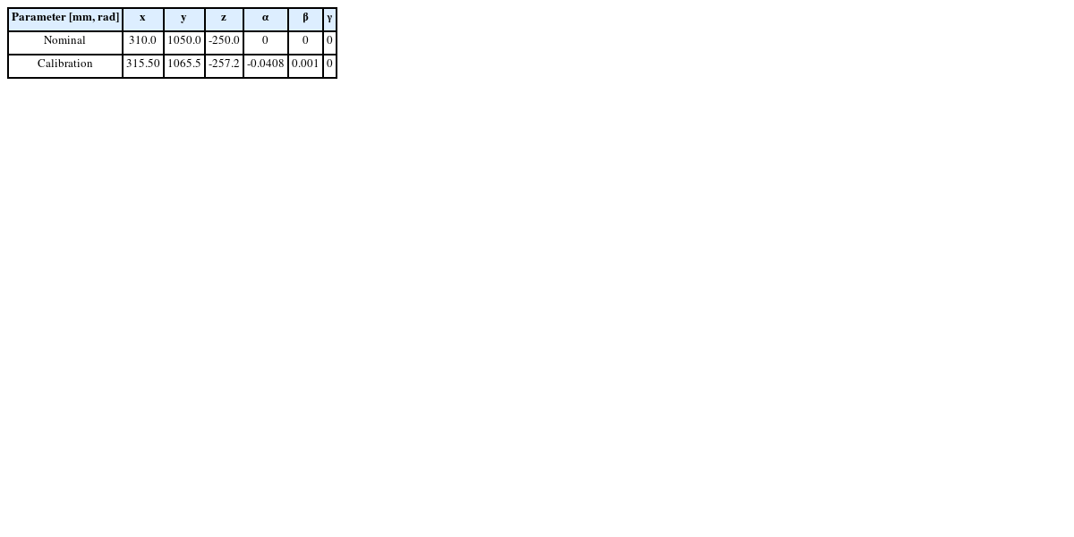 좌표계 변환 행렬 캘리브레이션은 식(2)에서 디지타이저로 로봇 말단 위치를 측정하여 로봇 기준 좌표계로 변환한 값(TDigitizer Robot PDigitizer )과 로봇 기준 좌표계에서 계산된 로봇 말단 위치 값(PRobot) 간 발생하는 위치 오차(dP)값을 최소화하는 최적의 변환 행렬 파라미터를 찾아내는 방법이다.