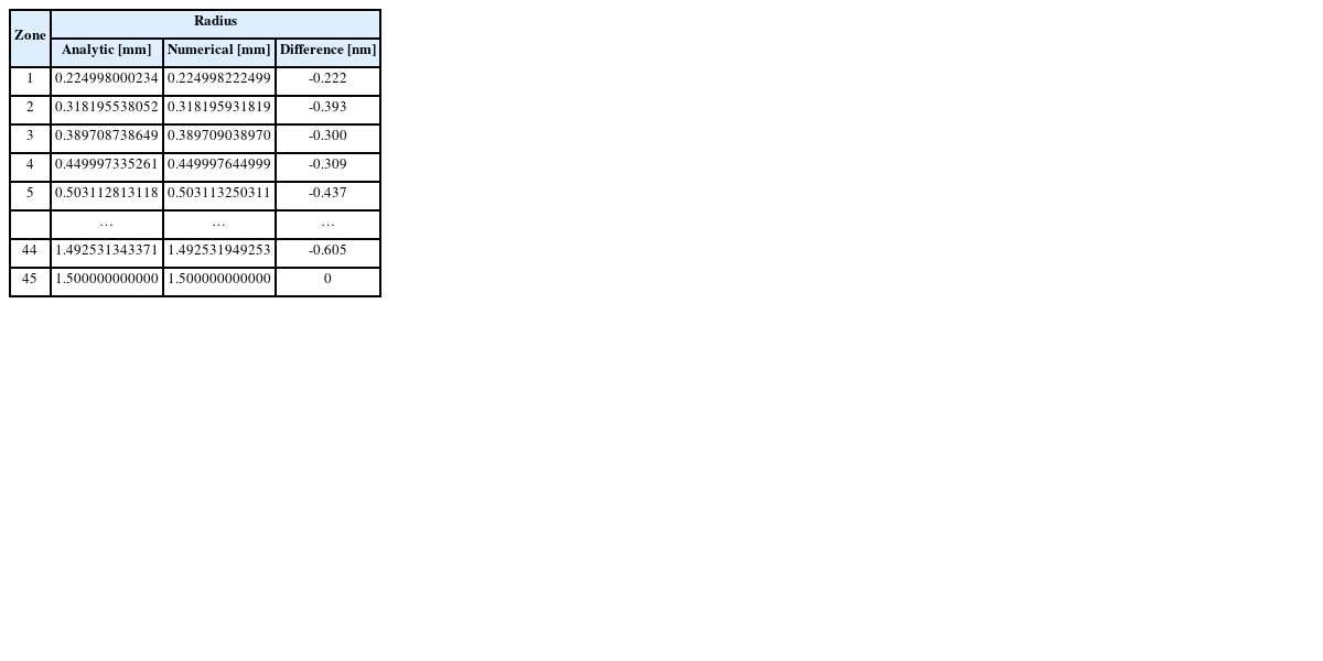 ® physical optics propagation (POP) which is calculated by scalar diffraction theory. The FZP pattern is implemented by the concentric circular apertures with corresponding radii that are entered sequentially in a user-defined aperture (UDA).