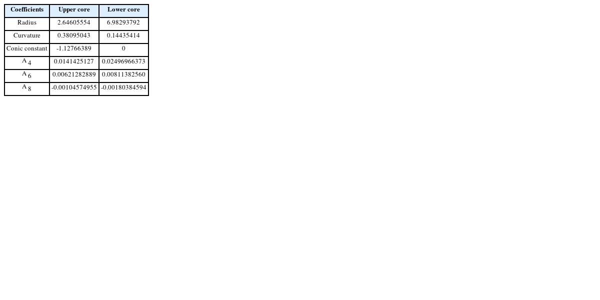 c is the curvature of the aspheric surface, r is the distance from the center of the lens, k is the conic constant, and An is the aspheric coefficient. Figures 5(a) and 5(b) show the designed surface profiles for 1 megapixel (MP), 140° field of view (FOV) high quality automotive lens core. To take into account the shrinkage of injection molding, the shape of the lens core was redesigned by multiplying the original aspheric coefficient by 1.004, as shown in Table 3. Especially for the 1 MP, 140° FOV automotive lens core, a flat land structure is required to form an etched surface region by grinding for scattering the incident light. Considering the tool diameter, the tool path was generated and simulated while checking the interference in the rib and flat land region as shown in Figs. 6(a) and 6(b).