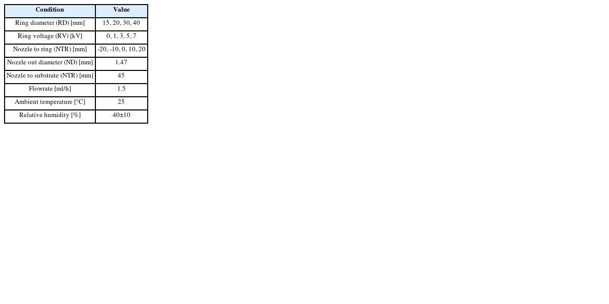 Table 2는 링 전극에서 실험적 매개변수에 따른 정전 분무의 액적 특성을 확인하기 위한 실험 조건을 나타낸 표이다. 실험에 사용된 링 직경은 15, 20, 30, 40 mm이다. 직경 15 mm 이하의 경우, 낮은 인가 전압 조건에서도 코로나 방전이 발생하므로 분무 모드를 확인하기 힘들기에 제외되었다. 링 인가 전압은 0, 1, 3, 5, 7 kV로 설정하였으며, 링의 인가 전압에 의한 분무 모드 및 액적 특성 영향을 확인하였다. 노즐과 링의 거리(Nozzle to Ring, NTR)의 경우, 링 설치 위치에 대한 분무 모드와 액적 특성을 파악하기 위해 -20~20 mm까지 10 mm씩 증가시키면서 실험을 진행하였다. 노즐 외경의 경우 외경 1.47 mm (Single Metal Nozzle, 17 gage)을 이용하였으며, 노즐과 기판의 거리(Nozzle to Substrate, NTS)의 경우 링에 대한 영향을 확인 하기 위해 45 mm에서 고정한 채 실험을 진행하였다. 유량의 경우 1.5 ml/h에서 고정하여 모든 실험을 진행하였다.