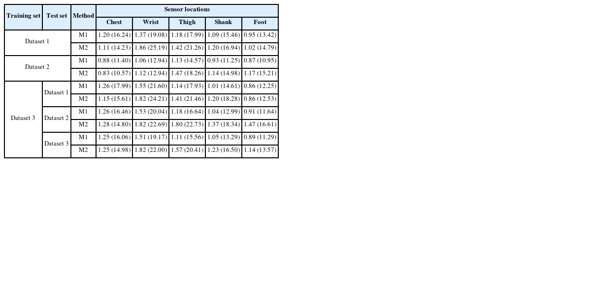 M1과 2의 성능을 비교하였을 때, Dataset 2의 학습 결과를 제외한 나머지의 결과에서 모두 M1의 성능이 우수하게 나타났다. M1은 각 보행 주기 동안의 데이터를 MLP 모델에 입력시키는 반면, M2는 일정 시간 동안의 시계열 데이터를 입력으로 받은 후에, LSTM을 통해 시간 흐름에 따른 센서 신호의 패턴을 찾아내는 방식이다. 보행 또는 주행은 입각기(Stance Phase)와 유각기(Swing Phase)가 반복되는 주기적인 동작이라는 점을 고려하였을 때, 일정한 시간의 데이터보다는 각 보행 주기 동안의 데이터에서 보행 조건별 패턴이 비교적 명확할 것으로 추측 가능하다. 따라서 에너지소모량 추정에 있어서 M1이 M2에 비해서 효과적인 것으로 판단된다.
