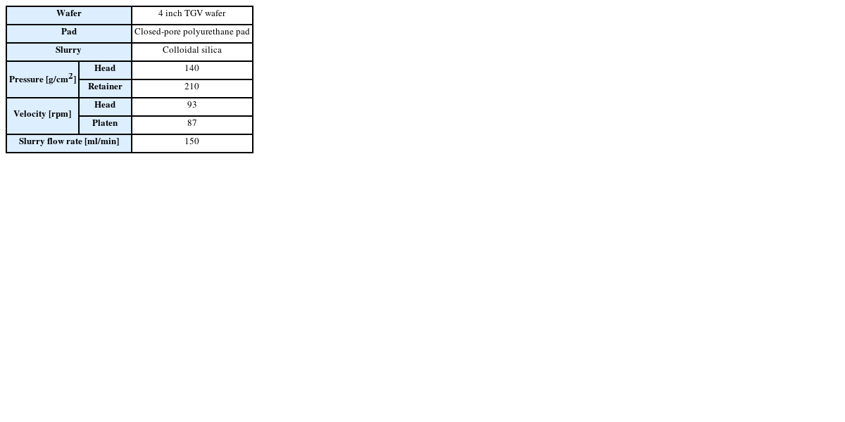 실험에는 유리 웨이퍼에 100 μm 직경의 Via를 형성하고 도금을 통해 구리를 양면으로 채운 4 inch 유리 웨이퍼를 사용하였다. 연마패드와 연마장비는 각각 KPX사의 KONI 패드와 G&P Technology 사의 POLI-500 장비를 사용하였다. 1차 연마 단계에서는 연마기에 설치된 IR 센서와 Piezometer를 활용하여 실시간으로 온도와 마찰을 측정하였다. 1차 연마의 경우, 도금과정에서 생긴 잔여 구리층을 빠르게 제거하여 연마 종점에 도달하기 위해 구리에 대한 재료 제거율이 높은 슬러리를 사용하였다. 2차 연마의 경우, 일반적으로 유리 웨이퍼의 연마에서는 유리의 높은 재료 제거를 위해 Ceria 연마재를 사용하지만, 다음 단계 공정에서의 표면 거칠기와 결함에 대한 엄격한 사양에 의해 Colloidal Silica 연마재를 사용한 슬러리를 사용하였다