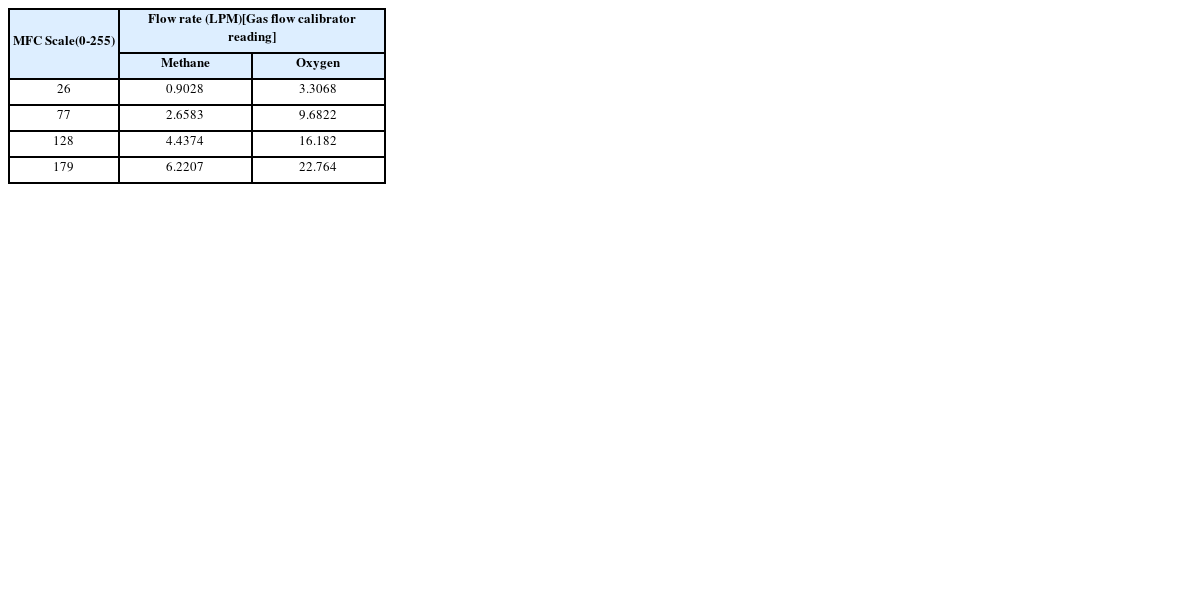 Fig. 9는 아두이노의 푸시 버튼을 이용하여 MFC의 개방정도를 4단계(26, 77, 128, 179)로 늘릴 때, 메탄과 산소의 MFC 출력 유량의 변화를 하나의 그래프로 나타낸 것이다.