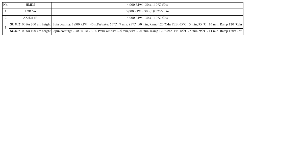 Spin coating: 1,000 RPM - 45 s, Prebake: 65°C - 7 min, 95°C - 50 min, Ramp 120°C/hr PEB: 65°C - 5 min, 95 °C - 16 min, Ramp 120 °C/hr |